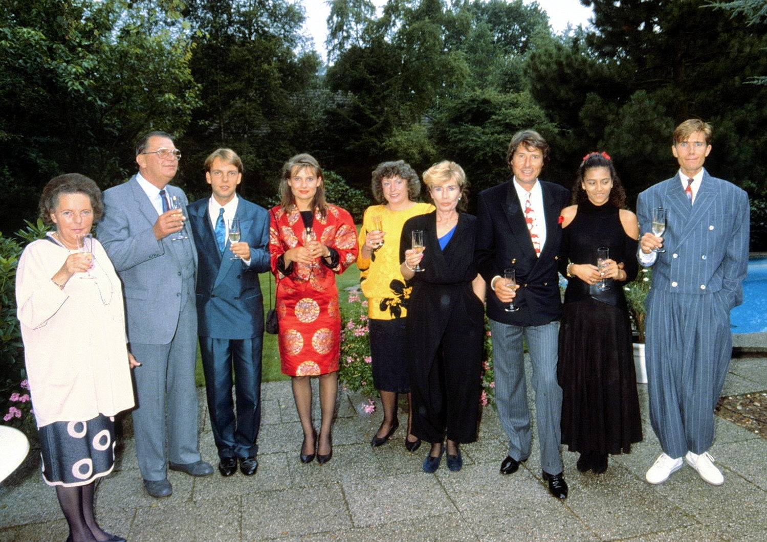 Udo Jürgens und Ehefrau Panja (3. und 4.v.re.), Tochter Jenny und Schwiegersohn Michael Lindner (3. und 4.v.li.), Sohn John und dessen damalige Lebensgefährtin Jeanne (Paar re.), den Bräutigams-Eltern Oscar Lindner und Ehefrau Edit (Paar li.) sowie Standesbeamtin Christel Leopold nach Jenny und Michaels Trauung zu Hause bei Peter Bischoff